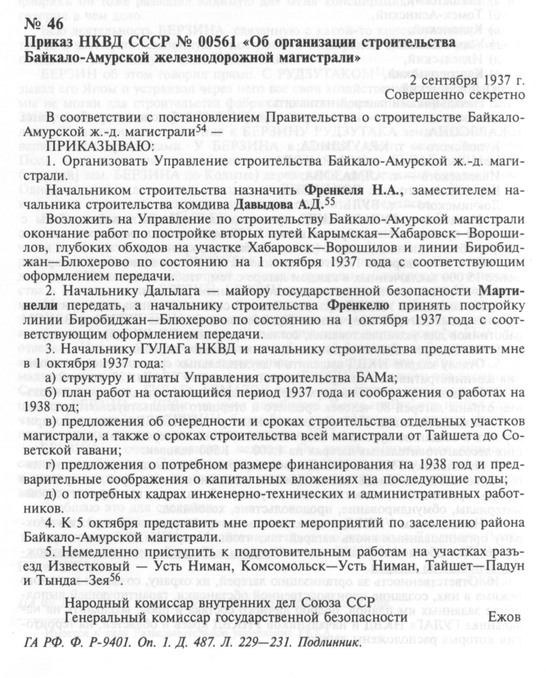 Приказ НКВД СССР "Об организации строительства Байкало-Амурской железнодорожной магистрали"