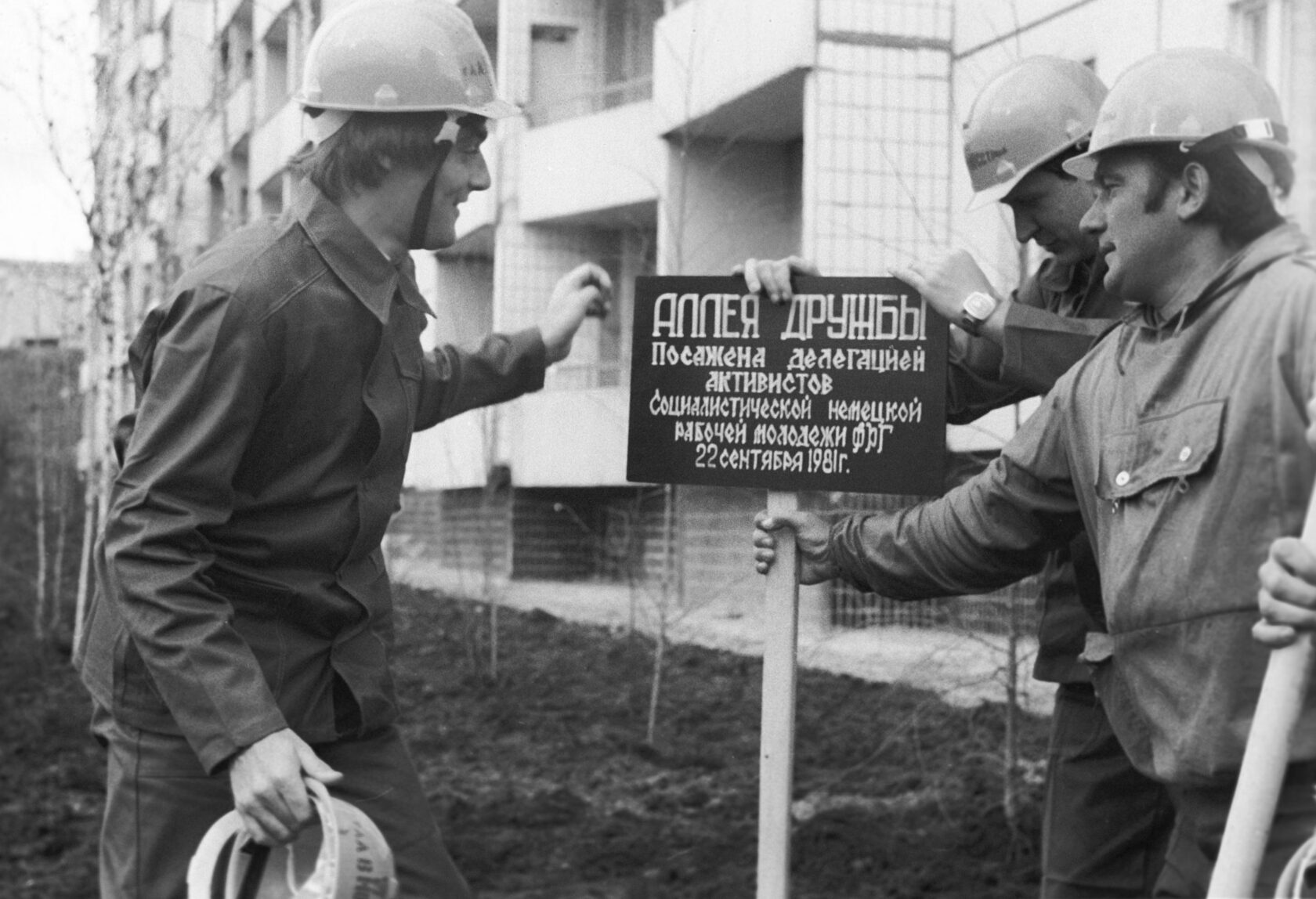 Члены делегации Социалистической немецкой рабочей молодежи (ФРГ), побывавшие на строительстве БАМа, посадили в одном из районов города Тынды "Аллею дружбы", 1981 г. РИА Новости