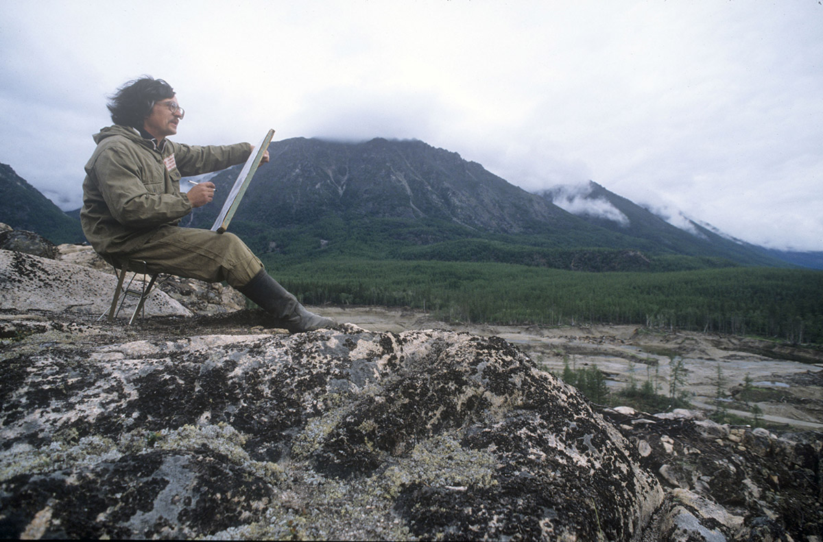Сергей Любомищенко, член бригады строителей Александра Бондаря и самодеятельный художник, на планере рисует красоты в районе Байкало-Амурской магистрали, 1984 г. РИА Новости / Игорь Михалев